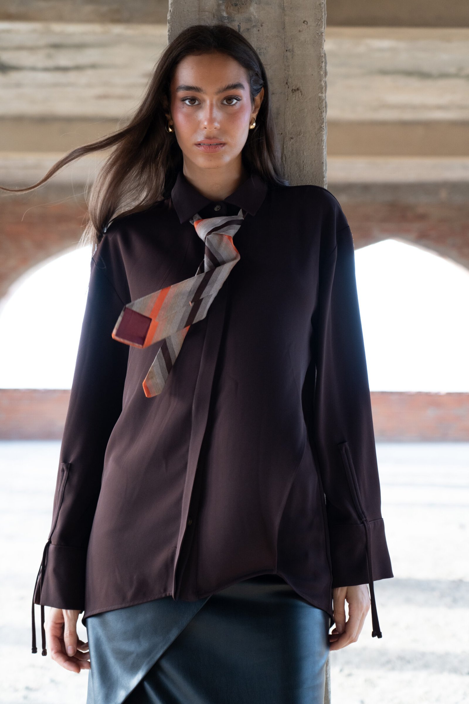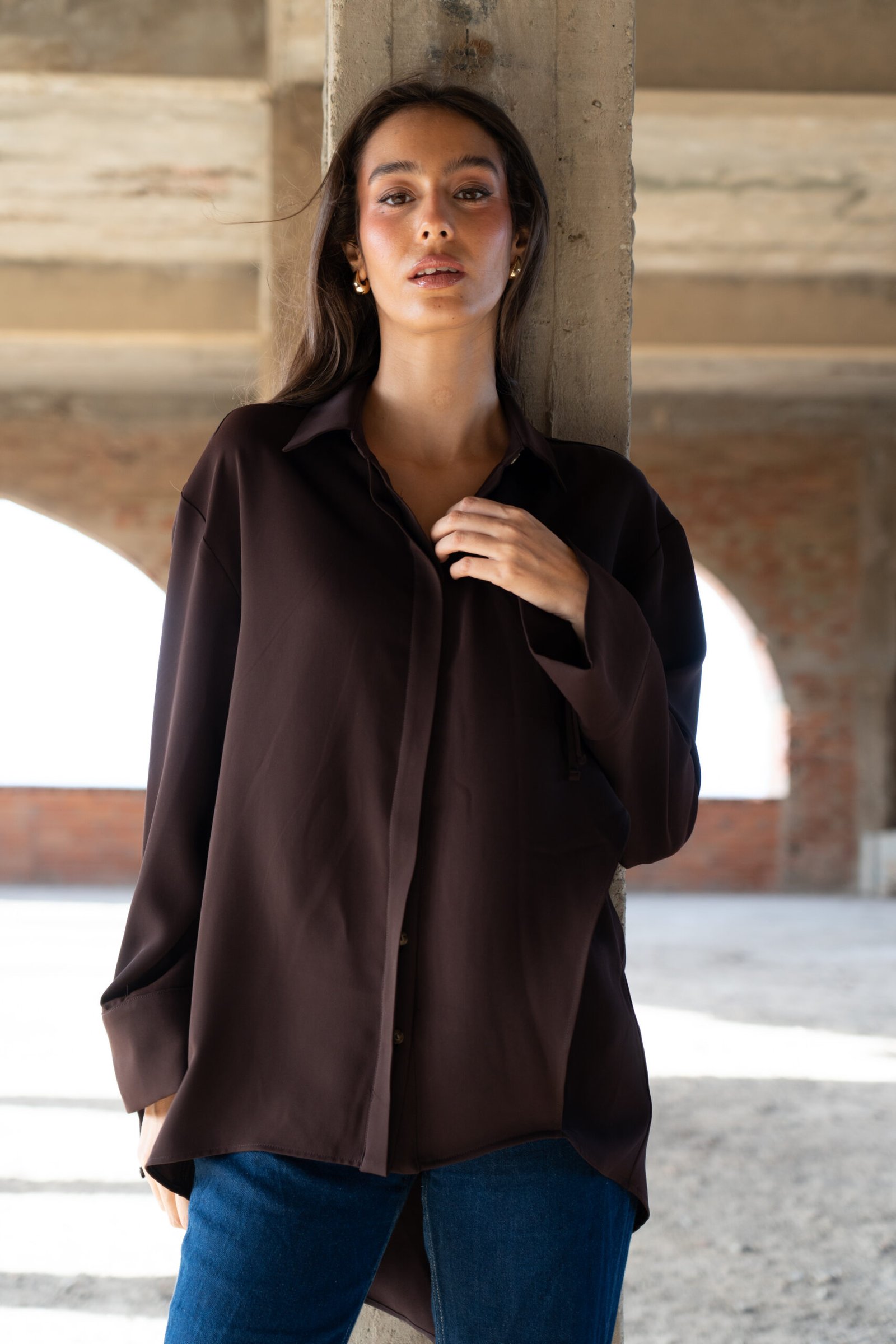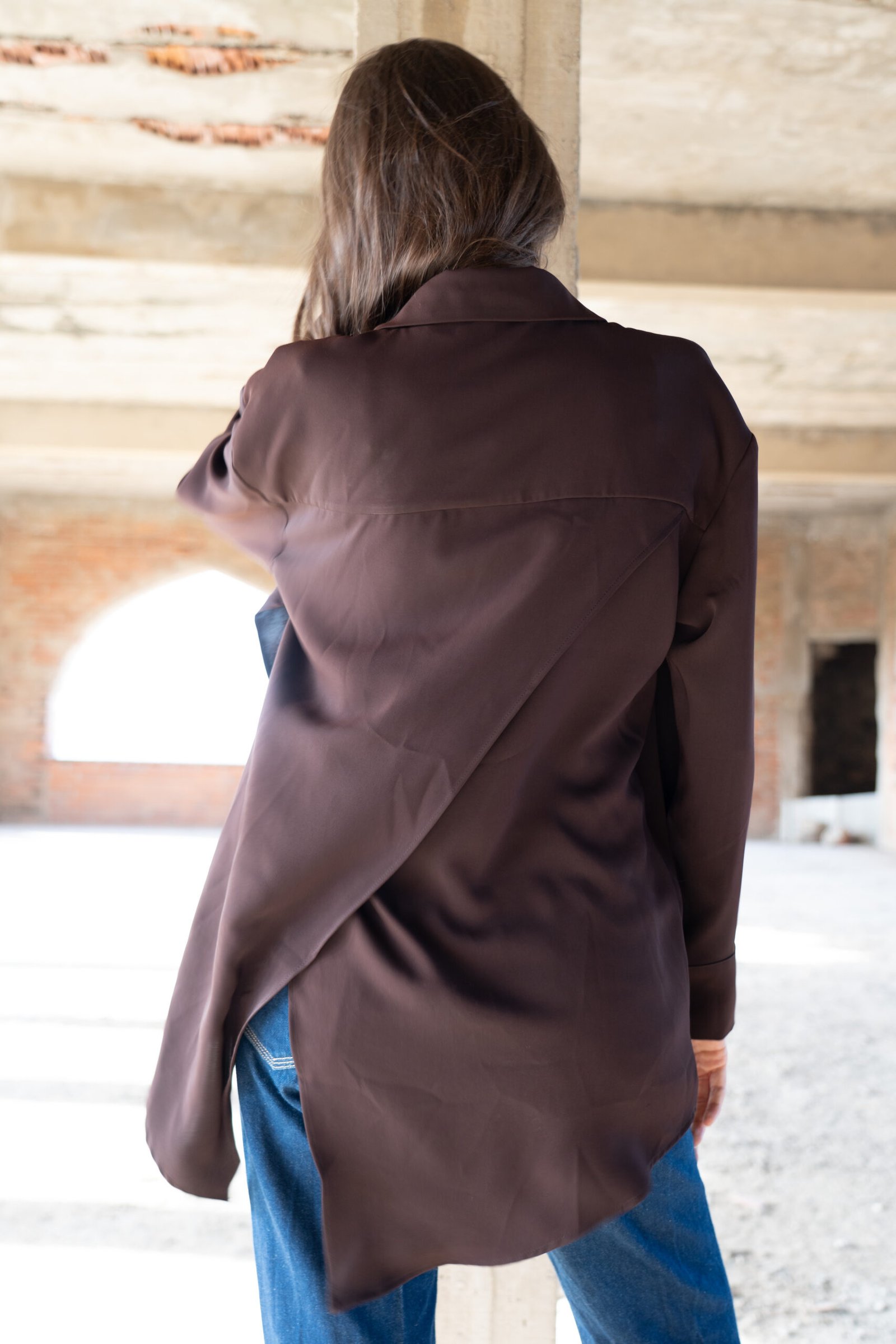 Cette chemise marron chocolat est confectionnée dans une crêpe légère (80% coton, 20% polyester) qui épouse le mouvement tout en conservant une tenue élégante. Sa coupe asymétrique à l’avant et dans le dos apporte une allure contemporaine subtilement graphique.