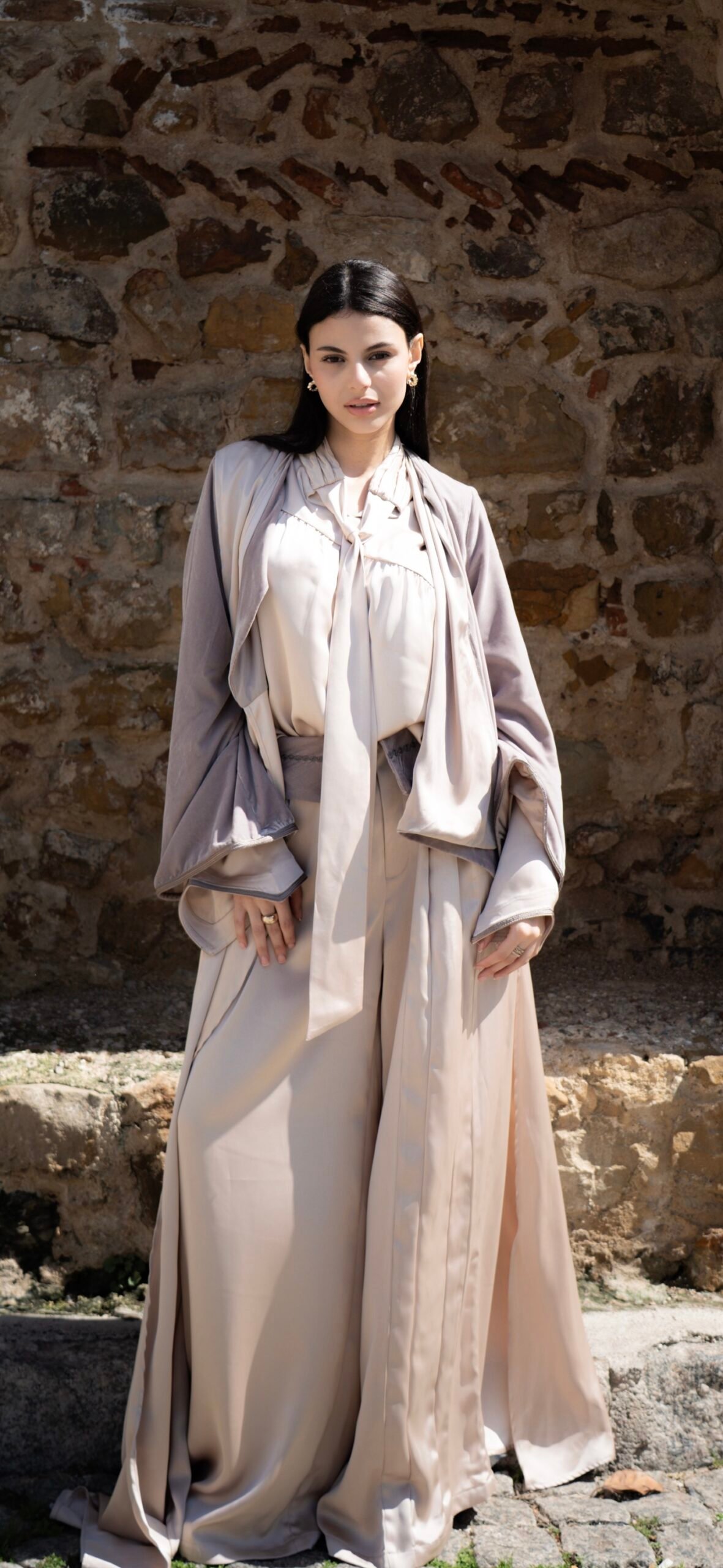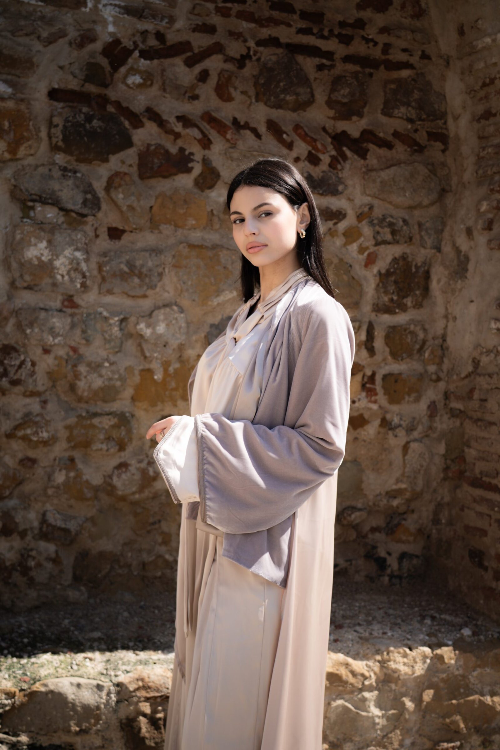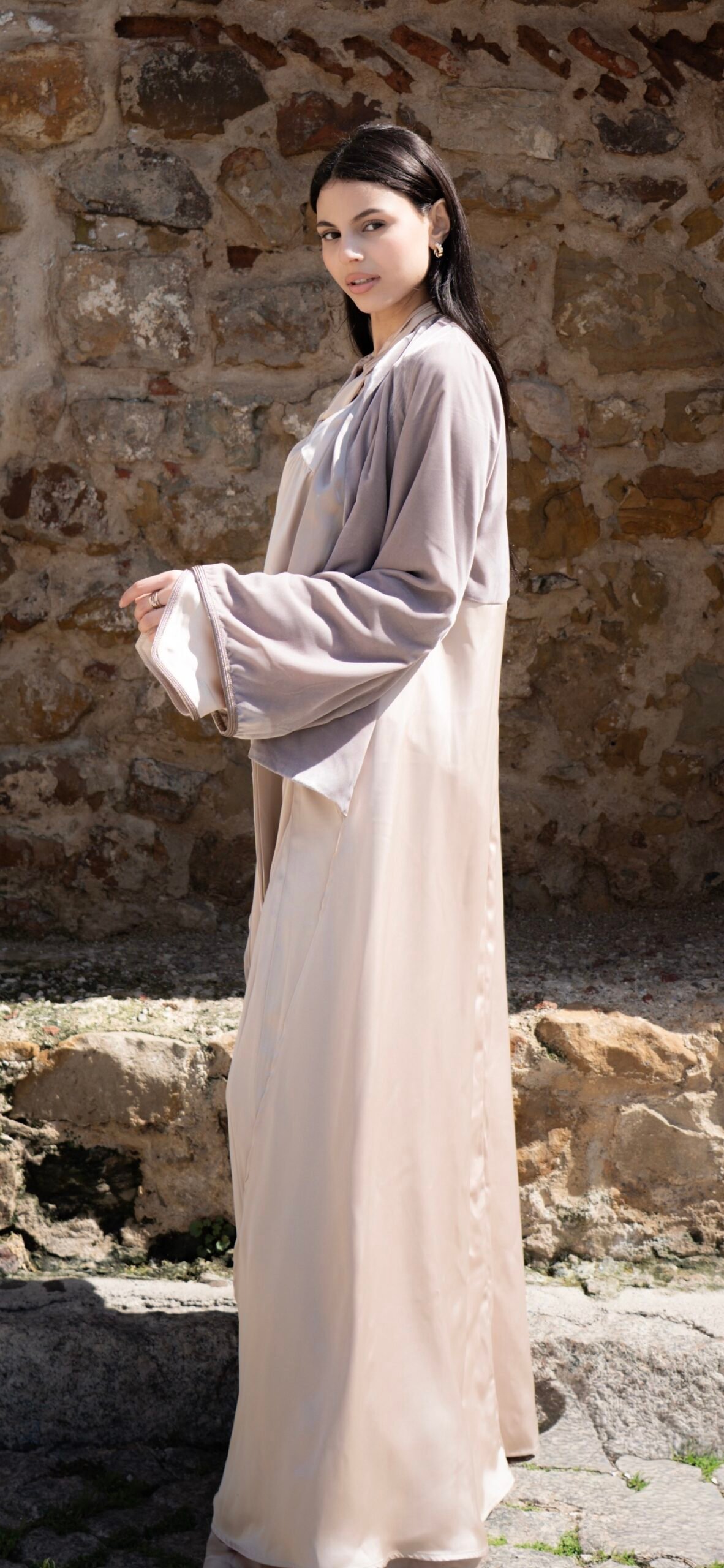 L’abaya oversize, pièce maîtresse de l’ensemble, révèle une allure majestueuse. Le haut et les manches sont réalisés en velours taupe, contrastant avec la fluidité du drap de soie beige qui compose la partie inférieure. Une écharpe en drap de soie assortie vient parfaire la silhouette avec élégance.