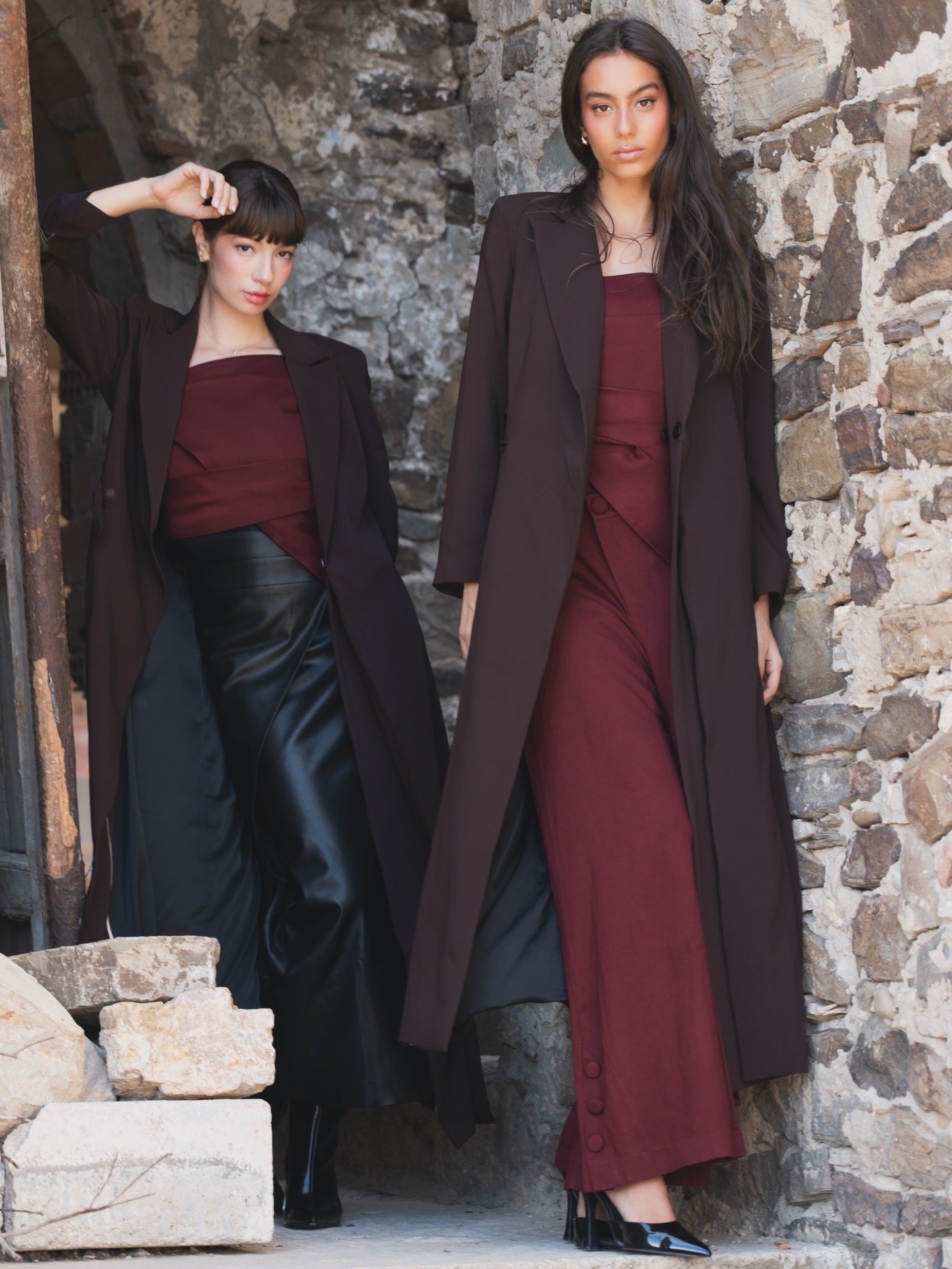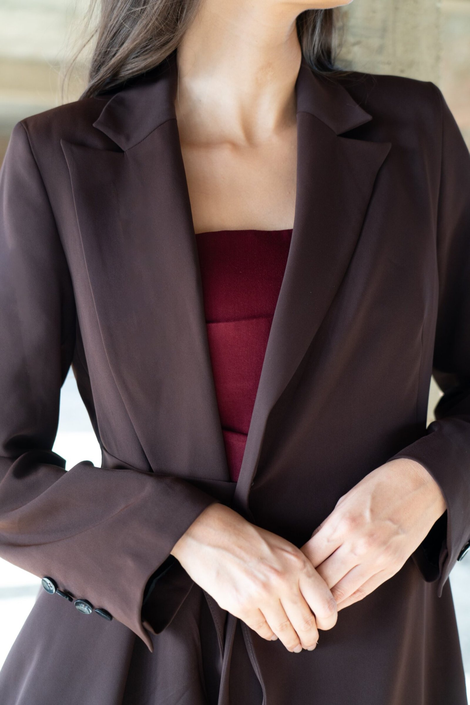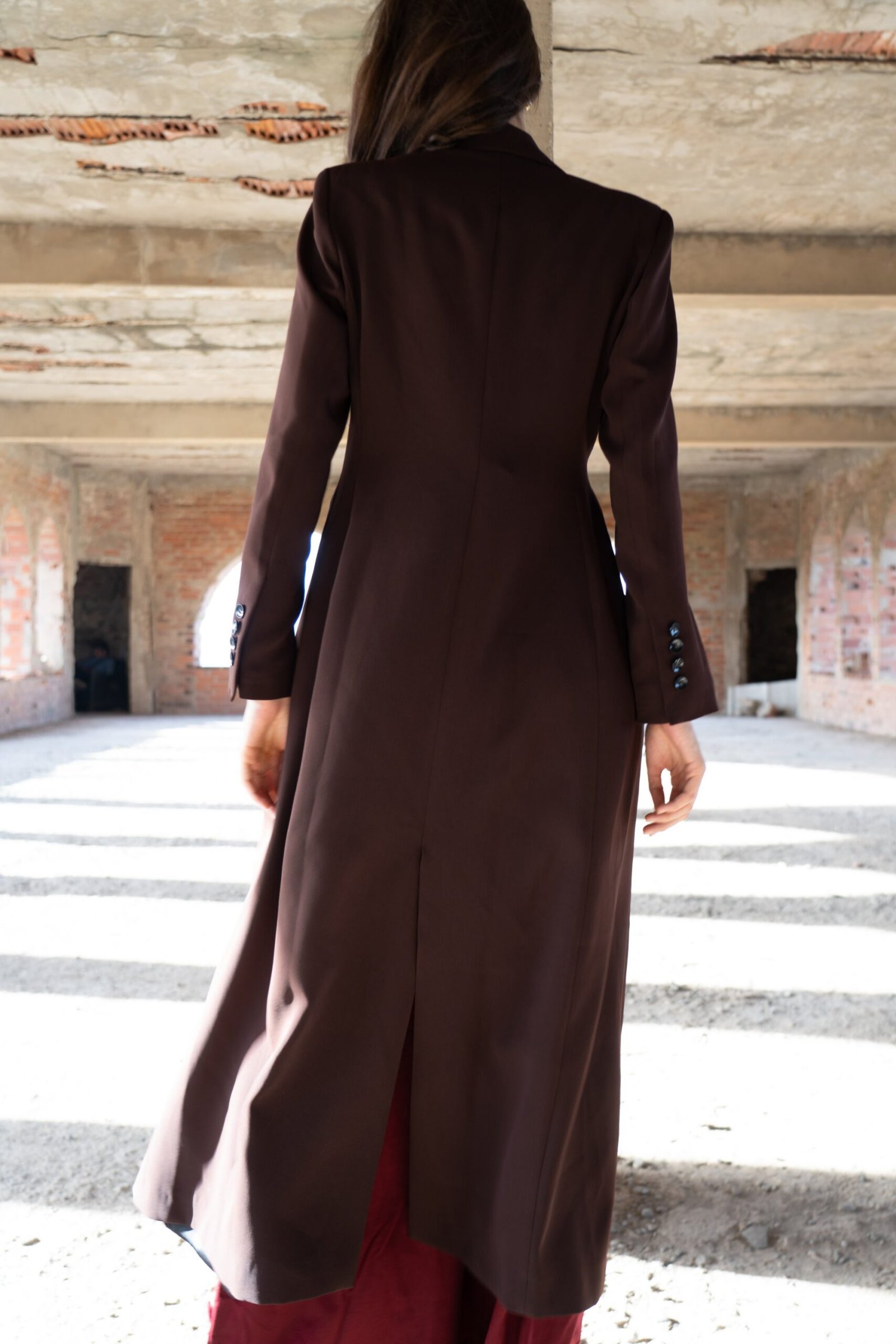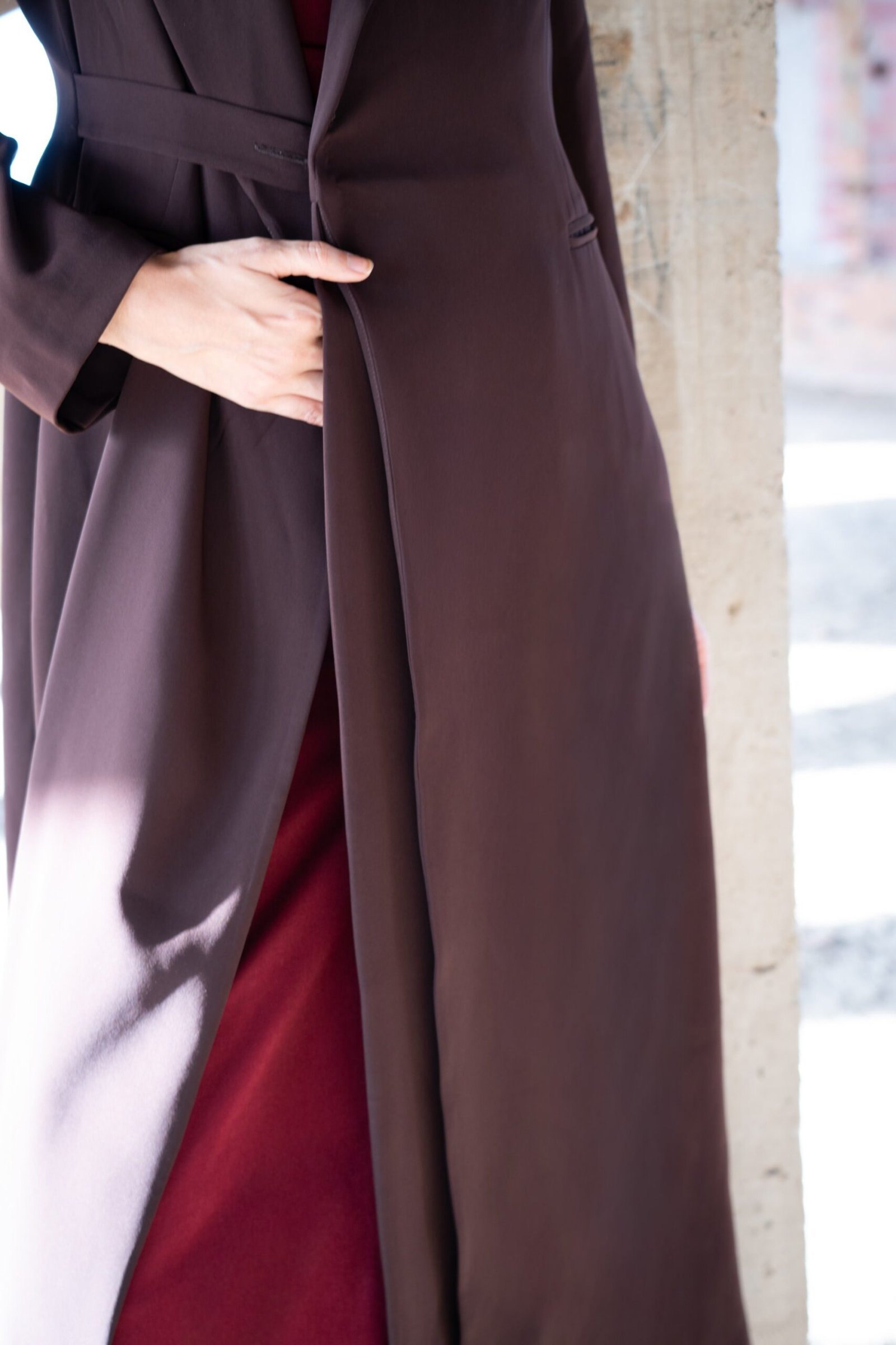 Audacieuse et élégante, cette veste asymétrique longue en crêpe marron chocolat (80% coton et 20% polyester)se distingue par sa doublure satin de soie et ses manches ornées de boutons ajoutant une touche raffinée à la silhouette.