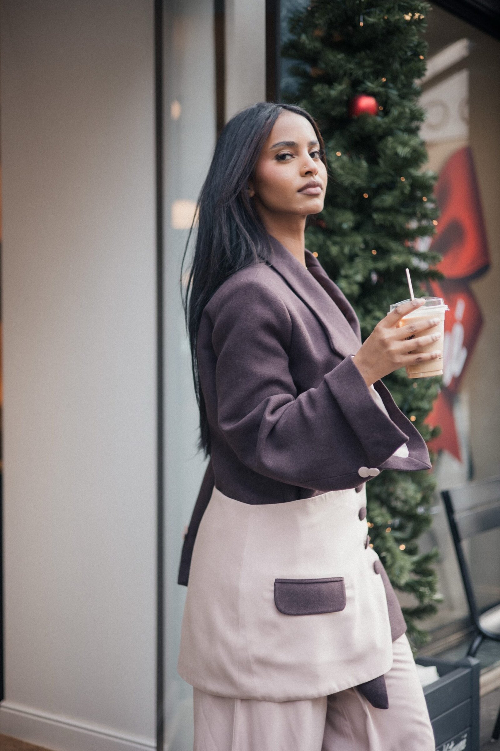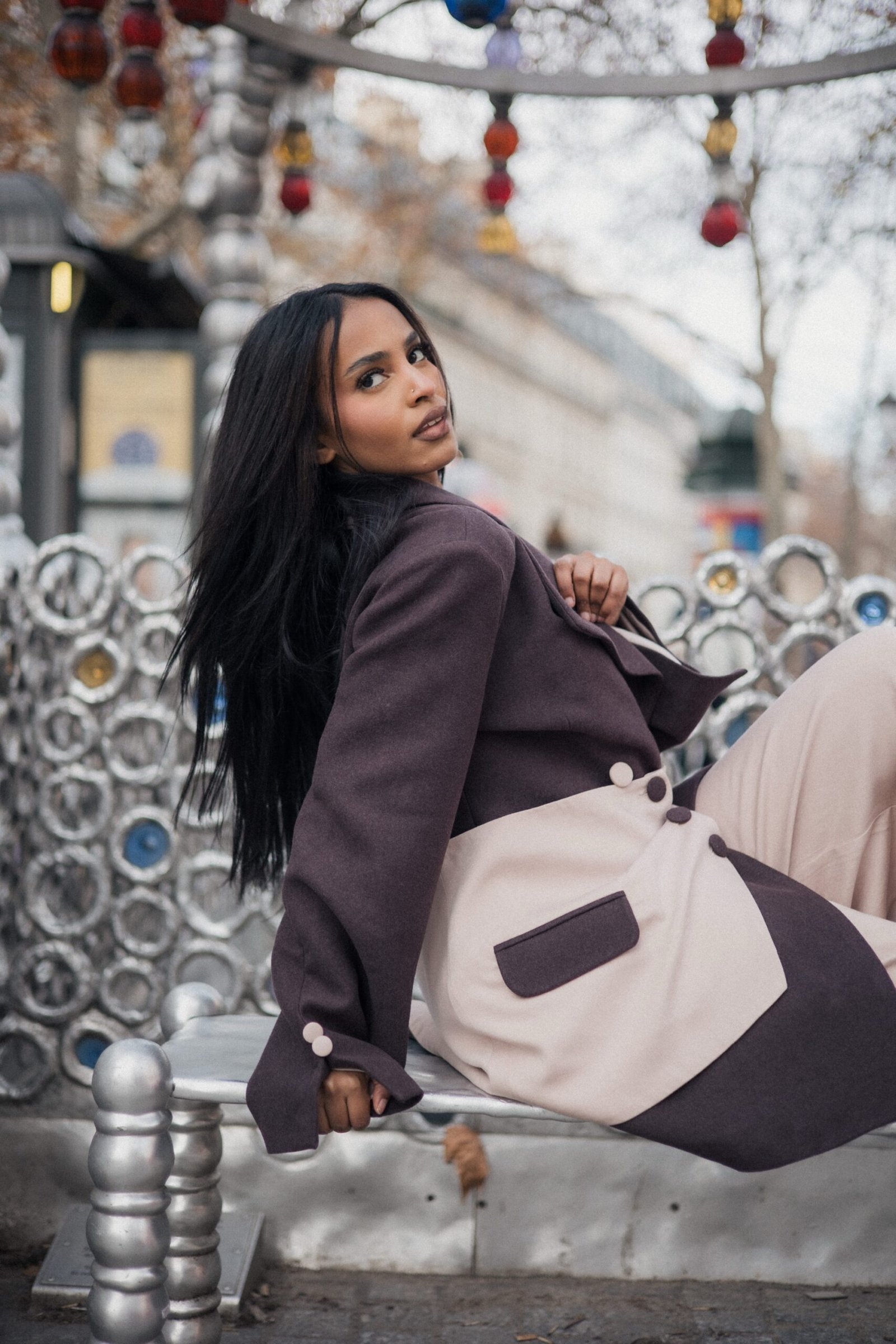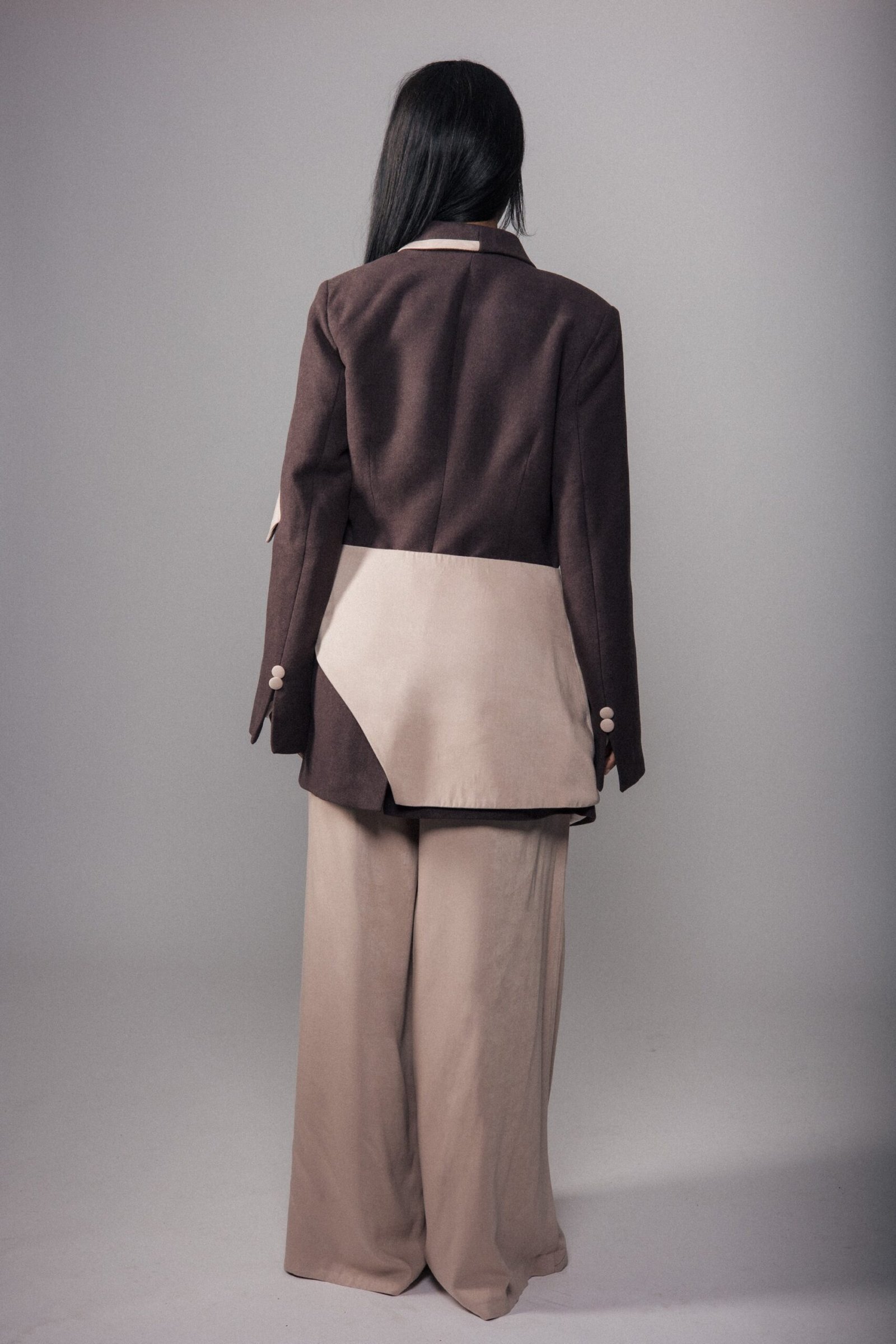 L’ensemble est sublimé par une ceinture asymétrique amovible, pensée comme un élément sculptural. Réalisée dans un tissu coordonné, elle se ferme par des boutons délicats et peut se porter à la taille, sur le pantalon ou par-dessus la veste. Son jeu de beige lumineux et de marron chocolat profond crée un rappel harmonieux avec la poche signature de la manche.